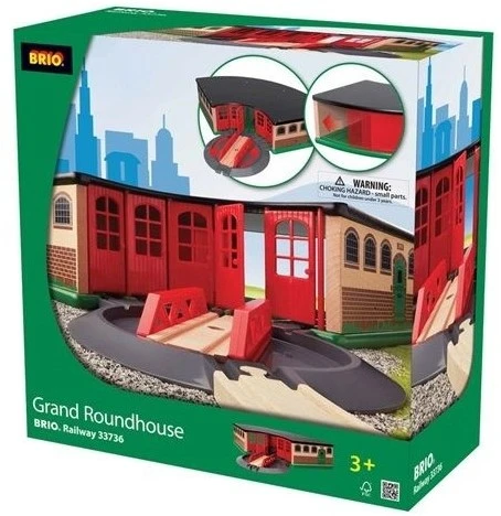 Wo werden die Züge abgestellt? Im großen Ringlokschuppen natürlich! Nimm die Drehscheibe, um die Züge gleich auf ihre individuellen Plätze zu stellen. Die hinteren Türen können geöffnet werden, was das Durchfahren von der Rückseite ebenso ermöglicht. Es passen fünf Fahrzeuge hinein und eine drehbare Weiche ist außerdem enthalten.