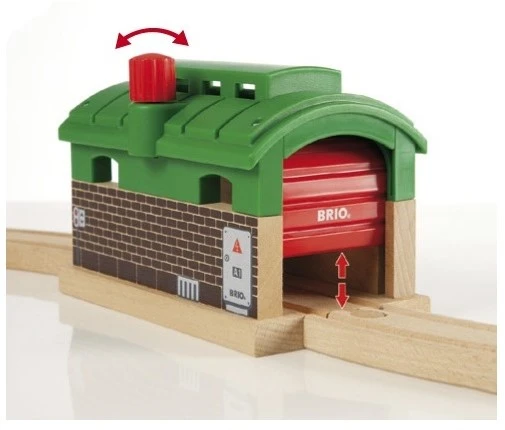 Wo ruht sich ein Zug aus? Natürlich im Lockschuppen. Ein perfekter Ruheplatz oder Ort für Reparaturen. Drehe den Knopf am Dach und die Tore öffnen sich. Mit geöffneten Toren ist der Lokschuppen auch als Tunnel einsetzbar.