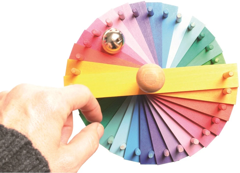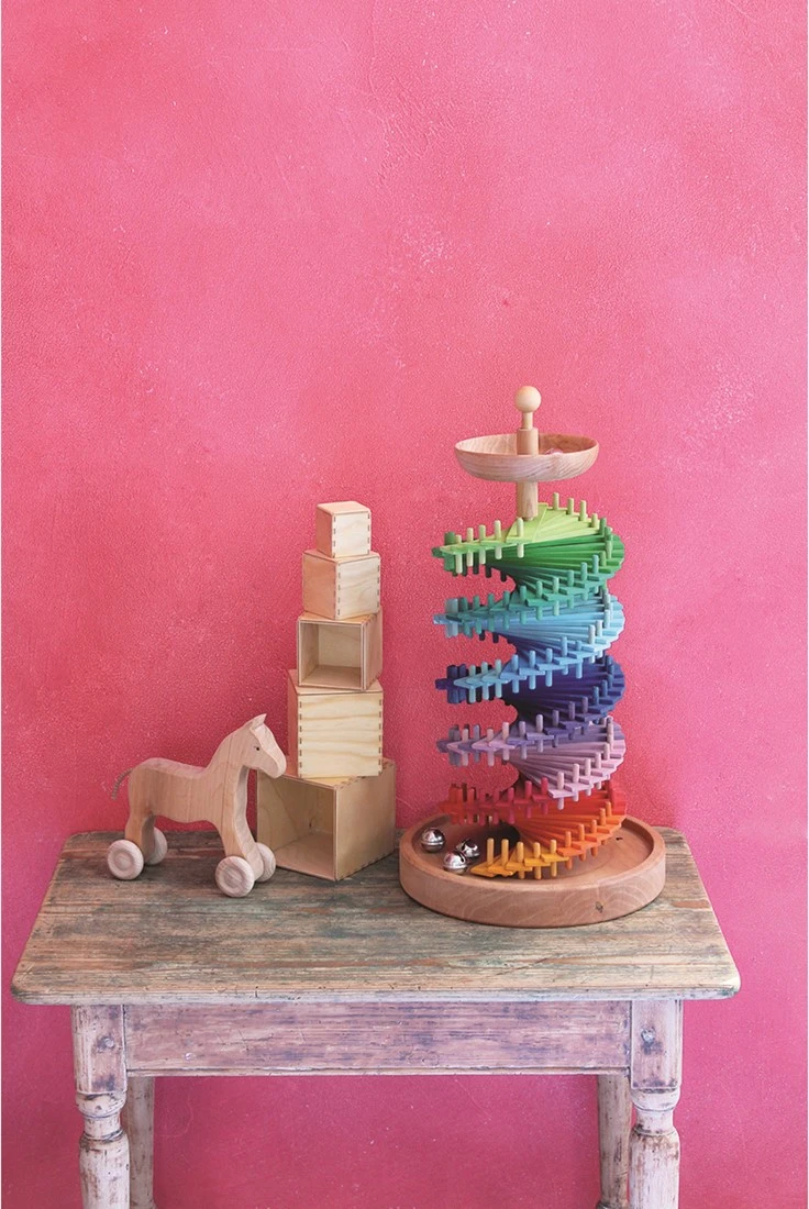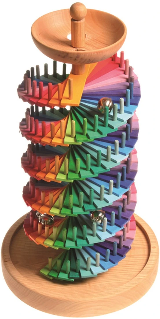 Mit dem Bausatz Kugelbahn kann man eine individuelle, doppelläufige Spiralbahn für Murmeln bauen. Die Kugelbahn darf selbst aufgebaut und nach Belieben farbig sortiert werden. Mit der sich ergebenden zweiläufigen Spiralbahn können auch Murmelrennen gespielt werden: Es kann beispielsweise eine Holzkugel gegen eine der mitgelieferten Kugelglöckchen antreten. Welche hier wohl gewinnt?