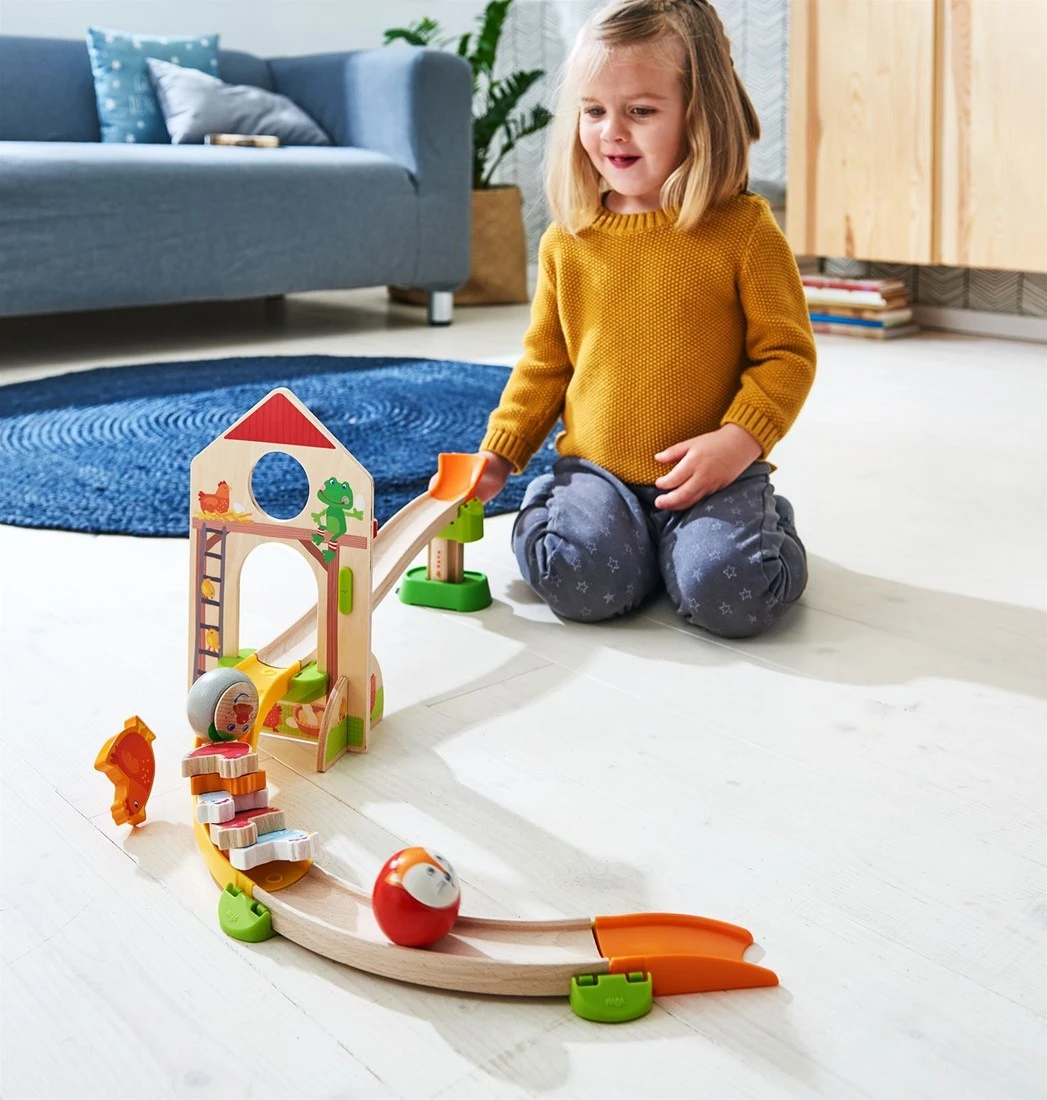 HABA Kullerbü – Kugelbahn Hühner-Domino. Nanu, ein Huhn in Pelz? Oh nein – Fuchs Frederik ist im Hühnerstall! Bauer Björn kullert sofort dorthin, um seinen Hennen zur Hilfe zu kommen. Die feinen Damen schauen zu, wie sich Fuchs und Bauer ein Rennen durch das Scheunentor liefern. Wer erreicht zuerst die Hühnerleiter und schubst die Dominosteine um?