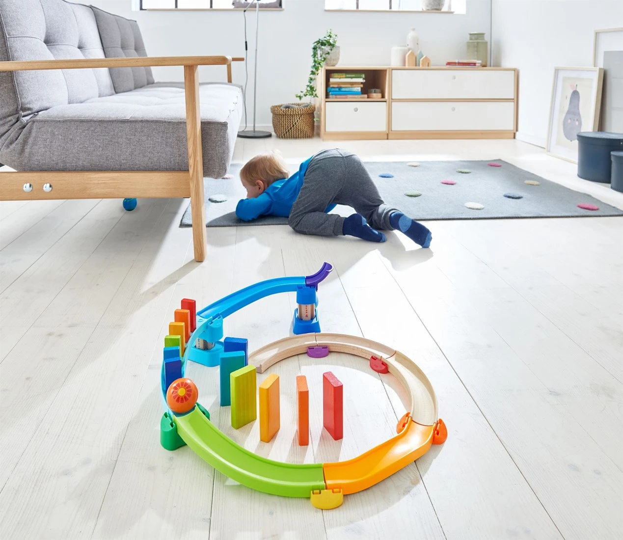 HABA Kullerbü – Kugelbahn Kringel-Domino. Es kugelt und kullert und – schwups! – schon fallen die kleinen Dominosteine auf der Dominotreppe in den schönsten Regenbogenfarben der Reihe nach um – und zwar je nach Aufbau aufwärts oder abwärts. Klick-Klack geht es die Dominotreppe entlang und mit viel Schwung saust die zweite Kugel anschließend um die Kurven, bevor sie die großen Dominosteine umschubst.