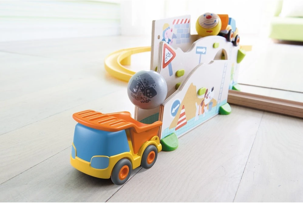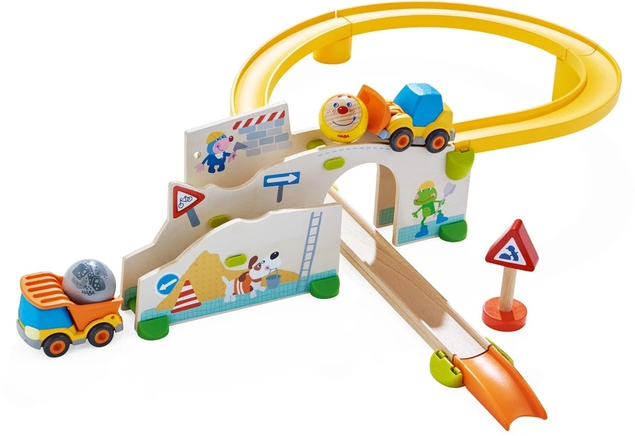 Bei der Kullerbü-Spielbahn Auf der Baustelle gibt es viel zu tun: Der Radlader schiebt die Kugeln in die Baustelle, während der Muldenkipper den Bauschutt in Kugelform wieder abtransportiert. Dank Steilkurve und Abfahrtsrampe kann Kugel Bauarbeiter Ben blitzschnell zur Baustelle sausen. Das Schöne am Kullerbü-System von HABA ist die Vielseitigkeit der Spielwelt: Dank Verbindungselementen ist sie stabil und sicher für die Jüngsten, und bereits der Aufbau fördert die Kreativität und Lust am Experimentieren. Rampen, Geraden oder Kurven lassen sich einfach und flexibel miteinander verbauen. Im Nu entstehen weitere tolle Streckenverläufe und fantasievolle Kullerlandschaften. Die bunte Spielbahn Auf der Baustelle ist eine Bereicherung für jedes Kinderzimmer!