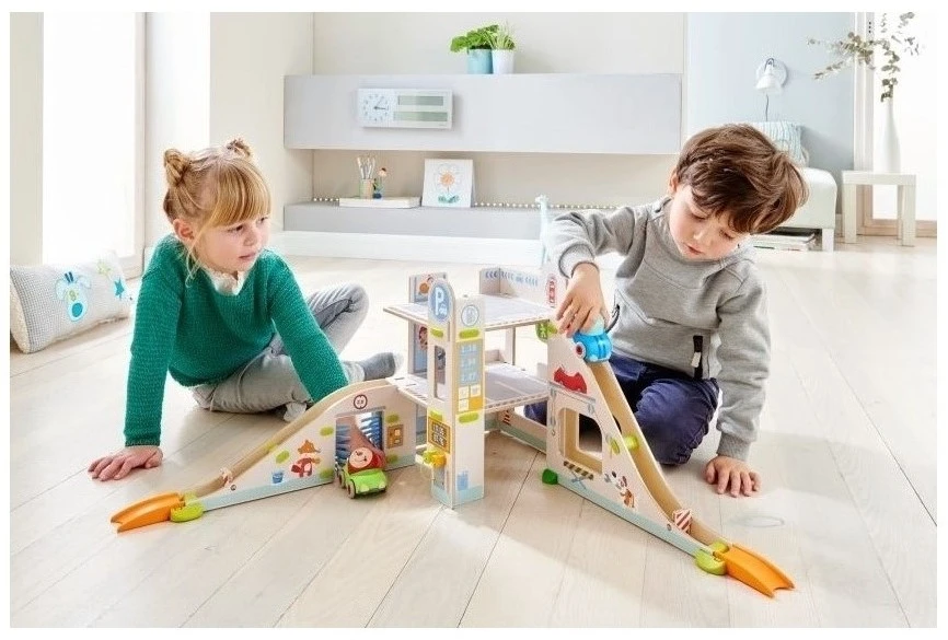 1 Parkhaus mit 2 Rampen, 2 Abfahrtsrampen, 1 blauer Flitzer, 1 grünes Kugel-Cabrio, 1 Kugel Nils Naseweis