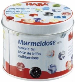 Klacker, klacker, kling! Eine Kugelbahn macht tierisch Spaß, vor allem, wenn die Murmeln pausenlos und schnell hintereinander über die Bahn sausen. Damit immer für genug Nachschub gesorgt ist, gibt es die HABA-Murmeldose. Sie enthält 36 mehrfarbige Glasmurmeln und 2 Metallkugeln die zur HABA-Kugelbahn passen. Die Murmeln mit ihren unterschiedlichen Farben und Strukturen sind für Kinder ein echter Schatz! Natürlich kann man mit den Murmeln auch ganz klassisch schnipsen und kullern. Aber egal, was man spielt – am Ende sind die Murmeln in der stabilen Metalldose sofort wieder aufgeräumt und keine Murmel kann verloren gehen.
