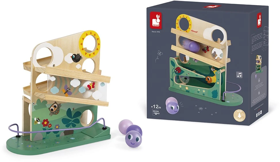 Die 3 Bälle rollen durch die Sonne und die Wolken, dann durch den durchsichtigen Tunnel, lassen das Glöckchen klingen und landen im Garten, wo sie eine Raupe bilden. Durch Verfolgen der Bewegung entwickelt Ihr Kind sein Sehvermögen.