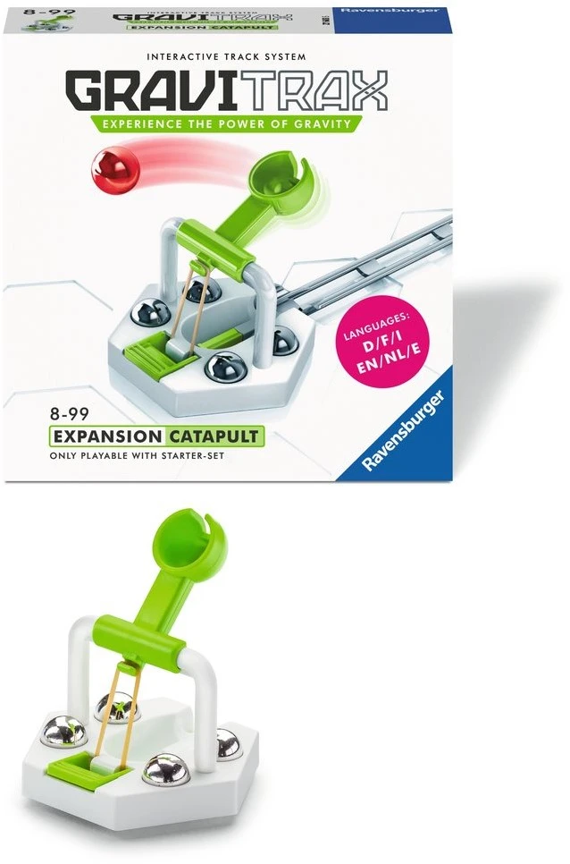 Ravensburger GraviTrax Catapult Expansion. Themenwelt: Ingenieurswesen, Produkttyp: Technik-Bausatz, Empfohlenes Alter in Jahren (mind.): 6 Jahr(e). EU TSD Warnung: Not for children under 36 months. Verpackungsbreite: 190 mm, Verpackungstiefe: 190 mm, Verpackungshöhe: 50 mm