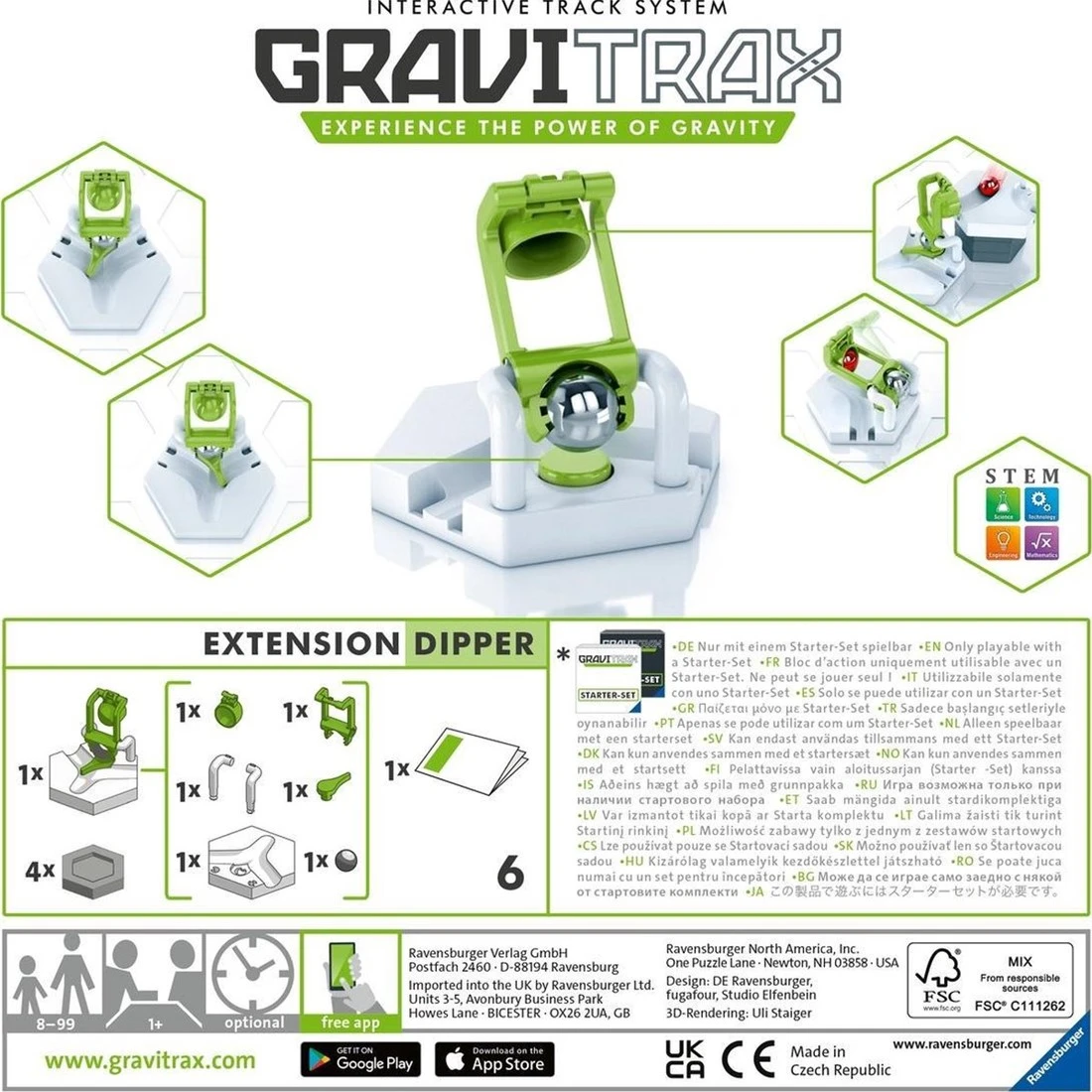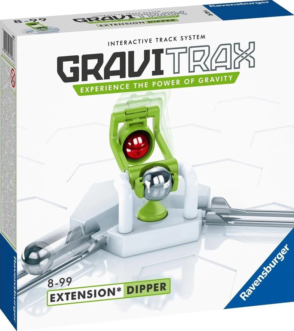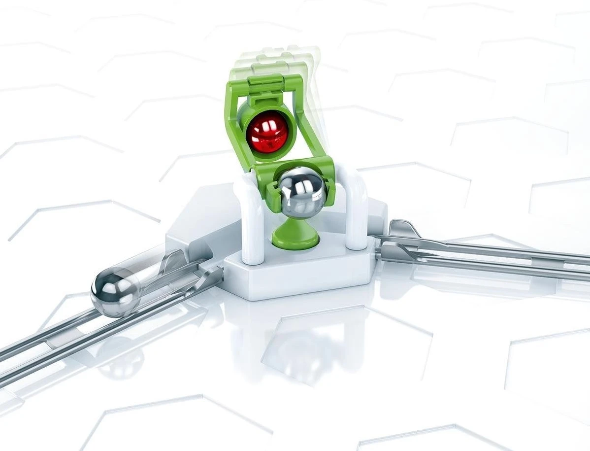 Der Dipper nimmt die Kugel auf, befördert sie nach unten und setzt sie ab. So werden verschiedene Ebenen miteinander verbunden. Es ist frei wählbar, zu welcher Seite die Kugel den Action-Stein verlässt. So kann in eine oder zwei Richtungen weitergebaut werden. Händisch kann nach jedem Durchlauf oder in unregelmäßigen Abständen die Seite gewechselt werden. Kombiniert mit dem Starter-Set bringt dies noch mehr Abwechslung in die Bahn. In welche Streckenverläufe taucht die Kugel mit dem Dipper ein?