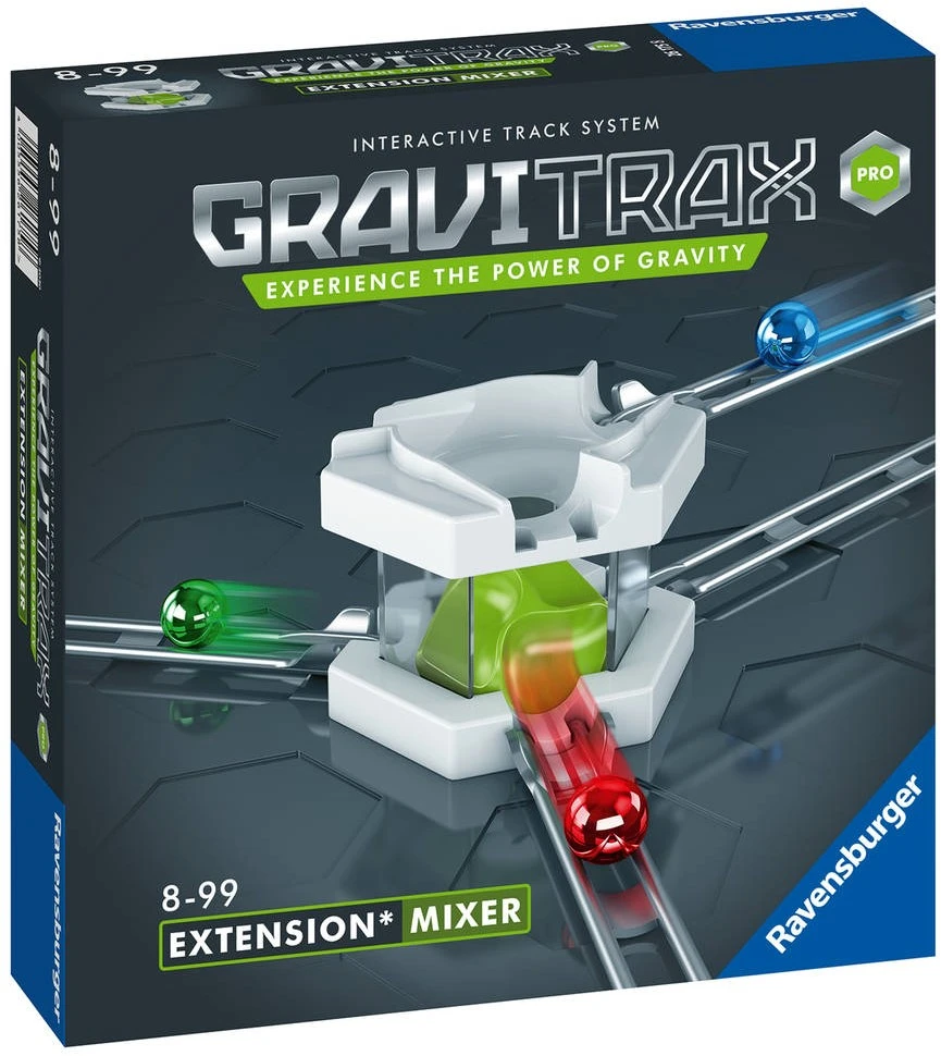 Der Mixer durchmischt den Weg der Kugel. Von bis zu drei Seiten können die Kugeln in den Mixer eintauchen. Entgegen des Uhrzeigersinns werden die Wege der Kugeln durchmischt, bevor sie den Mixer wieder über drei Ausgänge verlassen. Kombiniert mit einem GraviTrax Starter-Set bringt dies noch mehr Action in die spannende Welt der Kugelbahn. Wie oft lässt sich der Weg der Kugel mixen?